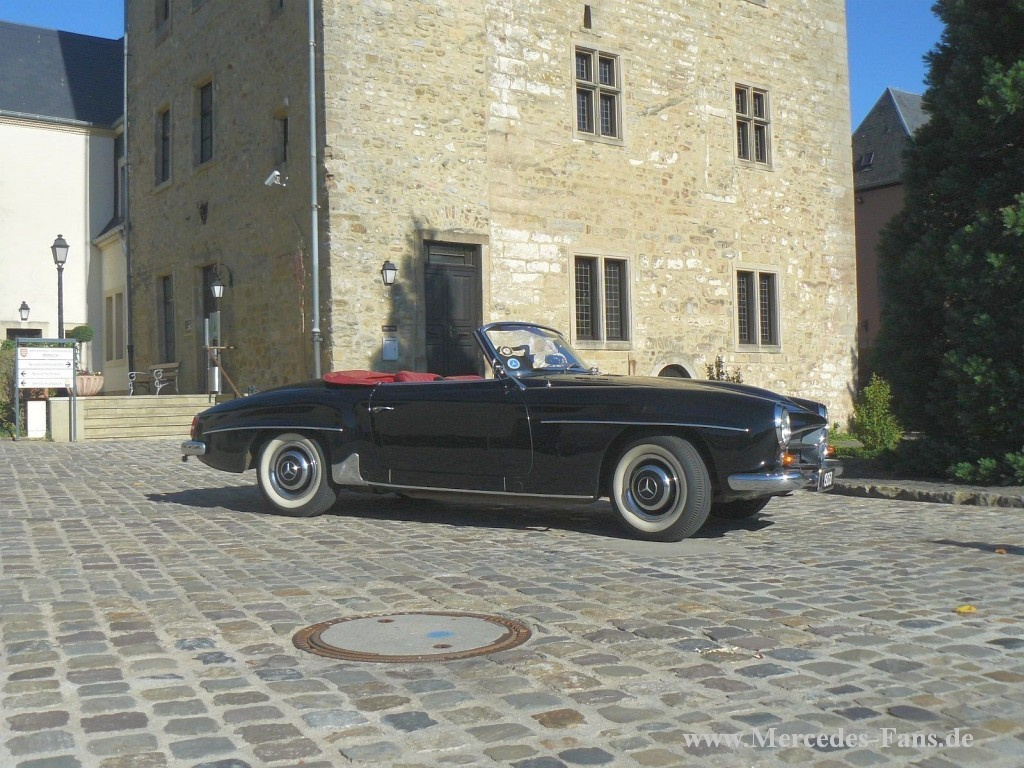 Schwarzer 190 SL mit roter Lederpolsterung, Erinnerungen werden wach an Frankfurter Hochkarat–Milieu in den Fünfziger Jahren des letzten Jahrhunderts. Das Auto einer gewissen Dame, das Zeitgeschichte machte… Ein makellos strahlendes Exemplar dieser Gattung an einem ebenso strahlenden Herbsttag auf malerischen Straßen rund um Luxemburg zu erleben, ist sicherlich eine Alternative zur damaligen Szene in Frankfurt, zumal es um einen Filmstar geht. Doch alles in der richtigen Reihenfolge...