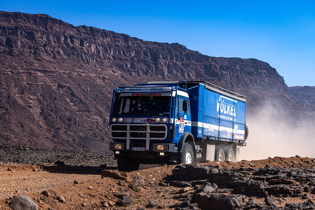 Zwei Mercedes-Benz Lkw-Legenden als rollende Werkstätten beim härtesten Rennen der Welt