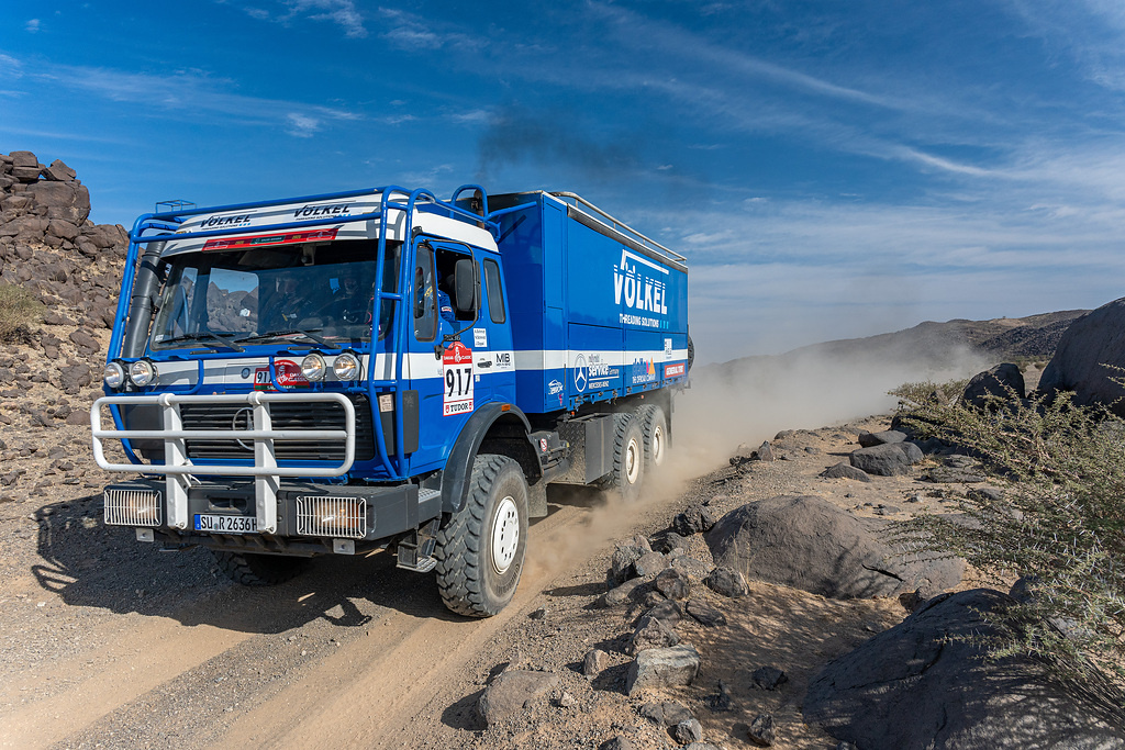 Zwei Mercedes-Benz Lkw-Legenden als rollende Werkstätten beim härtesten Rennen der Welt