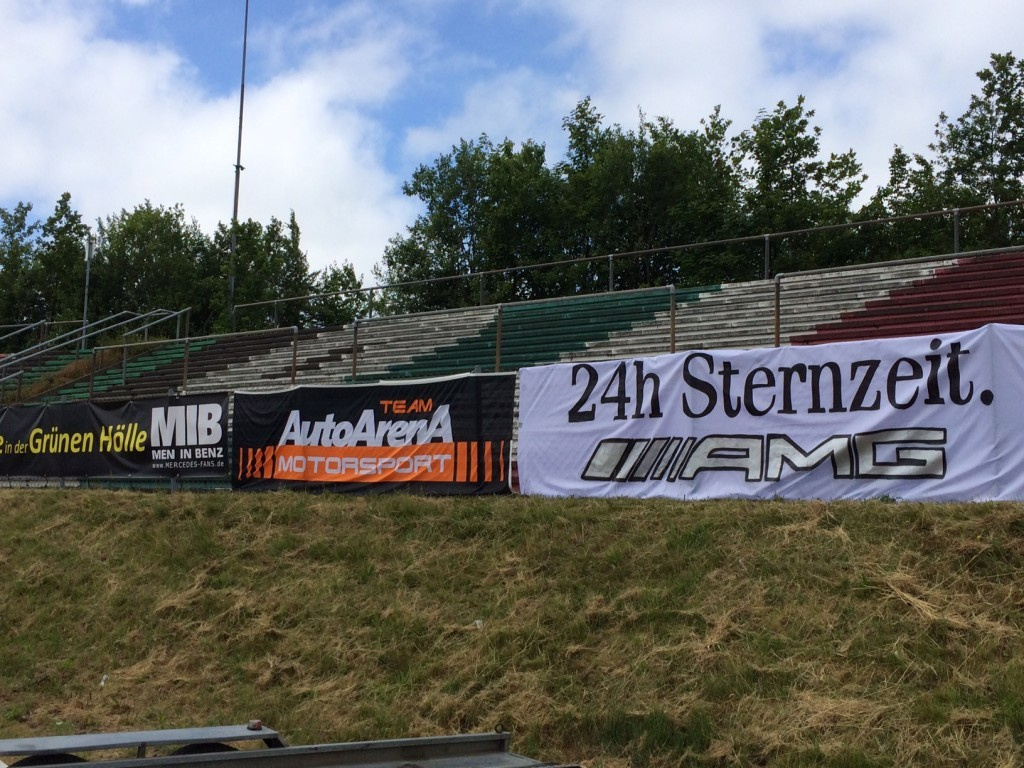 Ein leuchtender Stern und einige Spruchbanner machten deutlich, dass die Müllenbachschleife in diesem Jahr fest in der Hand der Mercedes-Fans war. Die ganze Müllenbachschleife? Nein, aber aber ein Areal, groß genug für ein Festzelt, eine Panorama-Terrasse mit Liegestühlen, die einen sensationellen Blick auf einen der interessantessten Streckenabschnitte des Rings erlaubte und ein leuchtender, überdimensionaler Stern direkt an der Strecke sorgten nicht nur für gute Stimmung, sondern auch für ein klasse Ambiente. Fahrer wie Christian Bracke und Patrick Assenheimer schauten vorbei und schrieben fleißig Autogramme. Auch Bernd Schneider schautew beim Mercedes-FanFest vorbei und erfüllte jeden Autogramm- und Fotowunsch. Samstagabend schauten die Mercedes-Fans dann erst gemeinsam den zweiten Auftritt der deutschen Fußball-Nationalmannschaft und anschließend wurde dann zusammen mit der band THE BRICKX u.a. bei Highwayx to Hell bis knapp vor 2:00 morgens die Grüne Hölle gerockt. Andere genossen lieber die Rennnacht auf der Panorama-Terrasse. Für uns ein tolles Erlebnis und für unsere Leser und Besucher sicher auch. Zumindest hatten bis Sonntagmorgen 500 Fahnen und 1000 Fan-Buttons den Besitzer gewechselt.