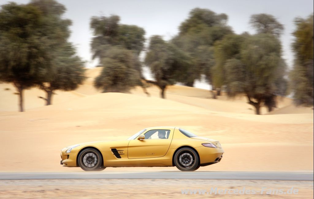 Der Mercedes-Benz SLS AMG präsentiert sich auf der „Dubai International Motor Show“ in einem faszinierenden Gold-Lack. Der seidenmatte Farbton mit der Bezeichnung „AMG Desert Gold“ verleiht dem neuen Supersportwagen eine außergewöhnliche Aura. Mattes Gold auf der Aluminium-Karosserie und wirkungsvoll gesetzte Effekte in hochglänzendem Schwarz – diese außergewöhnliche Farbkombination sorgt für eine hohe Anziehungskraft.