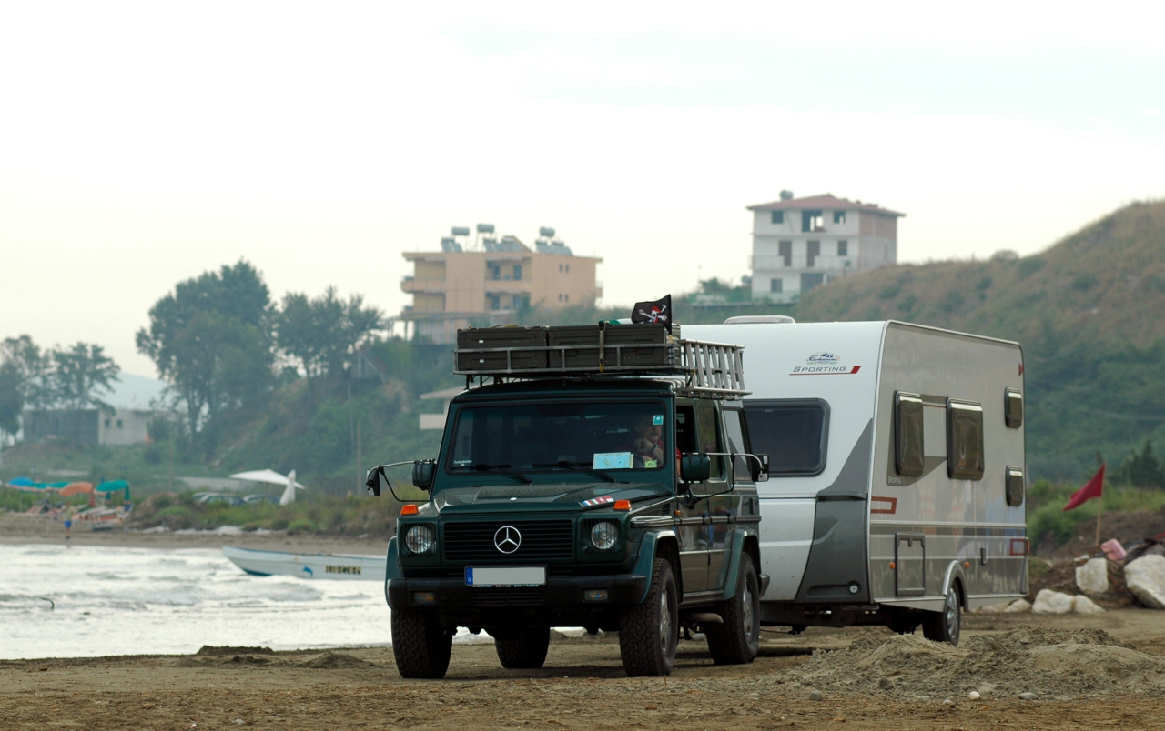 Mit 6,5m Wohnwagen am Strand von Kavaje, man beachte die Aussenspiegel... :-))