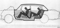 Ein erster Höhepunkt in der Serienfertigung ist 1959 die Premiere der Sicherheitskarosserie in der Mercedes-Benz Heckflosse (W 111). Entwickelt wird die Sicherheitskarosserie von dem Vordenker der Fahrzeugsicherheit Béla Barényi, der seit 1939 bei Daimler-Benz arbeitet. Zu seinen wichtigen Innovationen zählt auch das Sicherheitszapfen-Türschloss, das 1951 Premiere hat. Viele seiner Ideen sind so vorausschauend, das manche erst weit nach Barényis aktiver Zeit Serienstandard werden, beispielsweise der im Ruhezustand versenkt angeordnete Scheibenwischer, der 1979 in der S-Klasse der Baureihe W/V 126 eingeführt wird.