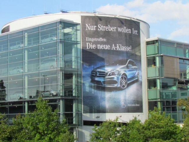 Wenn man so will, dann kann man von der Markteinführung der neue Mercedes-Benz A-Klasse in München von einem Auswärtsspiel sprechen. Doch für Mercedes in München ist die Tatsache, dass die bayerische Landeshauptstadt die Homebase der BMW Group ist, kein Grund, die Sache defensiv anzugehen. Nein, vielmehr war die Abteilung Attacke gefordert. Und so steht denn auch auf den Plakaten, welche die Ankunft der neuen Mercedes A-Klasse in München verkünden, zu lesen: "Nur Streber wollen 1er." (In Anspielung an das gleichnamige BMW Kompaktmodell). Das nennt man dann ja wohl eine Duftmarke setzen. Uns gefällt's! Dafür gibt's ein Like! (Bild: Mercedes-Benz München)
