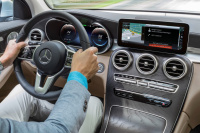 Wie man sich das Aussehen der Armaturentafel der neuen C-Klasse vorstellen darf, führte Mercedes-Benz bei der Premiere des Vorserienmodells des Mercedes-Benz GLC F-CELL auf der IAA im September 2017 höchstselbst vor. Aufnahmen von Erlkönigjägern bestätigten zwischenzeitlich, dass das Interieur des C-Klasse Facelifts so aussehen und ein Zentraldisplay mit 10,25-Zoll-Diagonale oberhalb der drei Lüftungsdüsen haben wird und ein 12,3-cm-Kombiinstrument mit digitalen Anzeigen verfügbar ist. Ebenfalls an Bord: Lenkrad mit Touch-Control Buttons links und rechts sowie ein Multifunktions-Touchpad ohne Drehrücksteller. Das COMAND System wird mit NTG 5.5 (NTG = Neue Telematik Generation) ausstaffiert. Die modellgepflegte C-Klasse wird ferner über eine optionale Smartphone-Integration verfügen, welche Apple CarPlay, Android Auto und MirrorLink sowie ein kabelloses Ladepad unterstützt. (Bild: S.Baldauf / SB Medien)