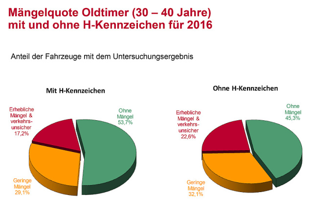 Ein ganz anderes Bild zeigt die Mängelstatistik mit Erreichen des Oldtimeralters. In der Altersklasse 30 bis 40 Jahre mit H-Kennzeichen sinkt die Zahl der Fahrzeuge mit Mängeln auf 46,3 Prozent. Der Anteil der erheblichen Mängel erreicht mit 17,2 Prozent ein absolutes Tief und liegt beim Mängelaufkommen auf dem Niveau der Pkw mit einem Alter von acht Jahren.