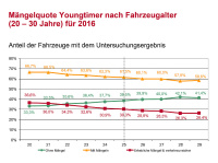 Ein Blick auf die Mängelquoten des Jahres 2016 macht die Unterschiede der einzelnen Altersklassen deutlich: Bei Pkw von sieben bis neun Jahren sind rund 33 Prozent der Fahrzeuge mit Mängeln unterwegs. Bei 10 bis 19 Jahren schnellen die Mängelzahlen rasant in die Höhe. Hier finden die Prüfingenieure der GTÜ bei rund 65 Prozent der Fahrzeuge Mängel. Bei den 20 bis 29 Jahre alten Pkw – den Youngtimern – ist der Zenit bereits überschritten und die Mängel gehen wieder leicht zurück. Hier weisen rund 60 Prozent der untersuchten Pkw Mängel auf.