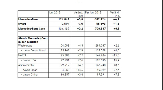Dr. Joachim Schmidt, Mitglied der Geschäftsleitung Mercedes-Benz Cars, Vertrieb und Marketing: Wir sind trotz schwierigem Marktumfeld in Südeuropa weiter auf Rekordkurs und haben im ersten Halbjahr mit einem Zuwachs von 6,9 Prozent das bisher beste Absatzergebnis verzeichnet. In den nächsten Monaten wird vor allem die Markteinführung der neuen A-Klasse unserem Absatz einen weiteren Schub geben. Wir sind somit gut unterwegs, dieses Jahr den Rekordabsatz aus 2011 zu übertreffen. Auch im Juni lag der Absatz von Mercedes-Benz leicht über dem hohen Niveau des Vorjahres.