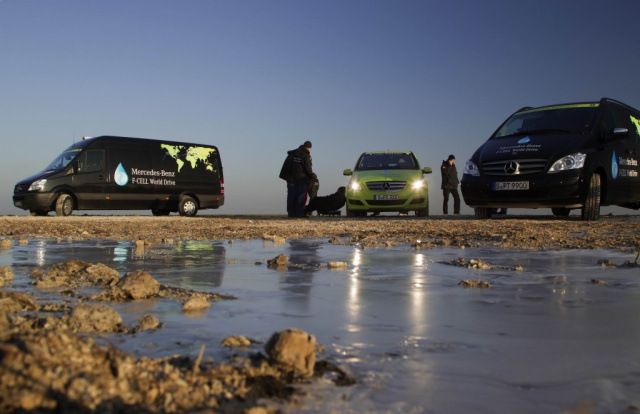 Hohe Aufmerksamkeit erleben derzeit drei Mercedes-Benz Fahrzeuge vom Typ B-Klasse F-CELL bei ihrer emissionsfreien Fahrt um die Welt. Bei dieser 30 000 Kilometer-Tour durch vier Kontinente und 14 Länder werden sie von acht Mercedes-Benz Transportern begleitet. Ganz im Stile einer guten Mannschaft bieten vier Sprinter und vier Viano ihren Pkw-Kollegen alle notwendige Unterstützung und helfen so, die technische Reife des emissionsfreien Elektroantriebs mit Brennstoffzelle und die Alltagstauglichkeit dieser Fahrzeuge zu demonstrieren. Hauptaufgabe der Mercedes-Benz Transporter ist die Betankung der F-CELL B-Klasse mit Wasserstoff. Denn weltweit gibt es bisher nur 200 Tankstellen, an denen Brennstoffzellenfahrzeuge mit diesem speziellen Kraftstoff versorgt werden können. Die Lösung dieser großen logistischen Herausforderung bietet ein speziell konstruierter Mercedes- Benz Sprinter 519 CDI (4x4), der mit einer mobilen Betankungseinheit ausgerüstet wurde. Der 190 PS (140 kW) starke Drei-Liter-Turbodiesel erlaubt ein hohes Reisetempo, so dass der Kontakt zu den F-CELL Fahrzeugen nicht abreißt. Die B-Klasse F-CELL hat eine Reichweite von rund 400 Kilometern. Leere Tanks können in rund drei Minuten aufgefüllt werden.