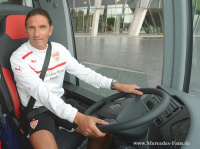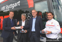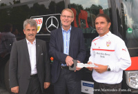 Fünf Wochen vor dem Start der neuen Bundesliga-Saison gab es für die Fußball-Profis des VfB Stuttgart ein Highlight. Hartmut Schick, Leiter Daimler Buses, überreichte VfB-Präsident Gerd E. Mäuser,- und der gesamten Mannschaft des VfB Stuttgart vor dem Mercedes-Benz Museum in Stuttgart den neuen Mannschaftsbus, einen Mercedes-Benz Travego Edition 1. Wir freuen uns sehr, dem VfB Stuttgart seinen neuen Mannschaftsbus aus dem Hause Mercedes-Benz überreichen zu dürfen. Dieser ist nicht nur sehr komfortabel, sondern auch sicher und umweltfreundlich genau das Richtige für den VfB Stuttgart, erklärt Hartmut Schick nach der Übergabe.