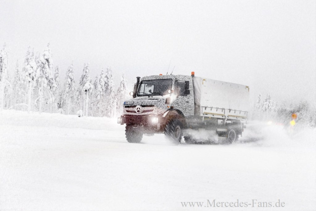 Noch in getarntem Zustand erreichen die Redaktion von Mercedes-Fan.de offizielle Fotos vom neuen Mercedes-Benz Econic, einem neuen hochgeländegänigigen Unimog und einem neuen Unimog Geräteträger. Die Bilder sind bei Testfahrten ibei minus 30 Grad Celsius am Polarkreis entstanden. Die Erprobung unter extrem wimterlichen Bedingungen dient vor allem der Optimierung Verbrauchswerte.