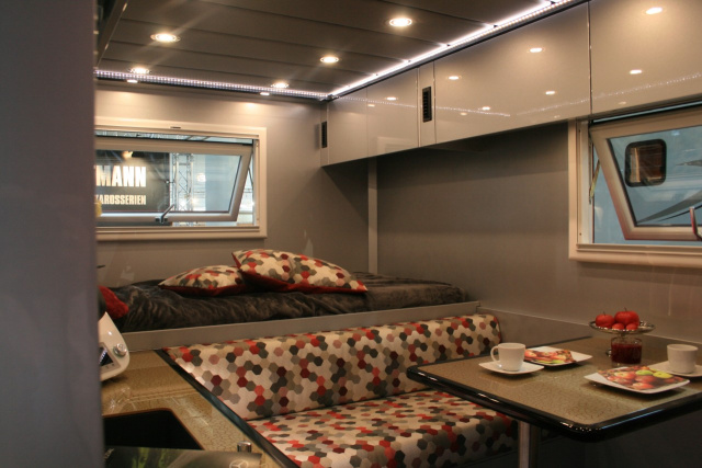 Vom Fahrerhaus aus kann über einen verschließbaren Durchstieg der Wohnraum betreten werden. Hinter dem Fahrersitz ist das Sanitärabteil mit Waschbecken, WC und Dusche untergebracht. Zum Heck hin schließt sich auf der Fahrerseite der Küchenblock an, ausgestattet mit Spüle und einem Gaskochfeld. In Fahrzeugmitte findet sich die Sitzgruppe, mit längs angeordneten Sitzbänken auf beiden Fahrzeugseiten. Quer im Heck ist die Liegefläche installiert. Umlaufende Dachstaukästen bieten Platz für leichtes Reisegepäck.