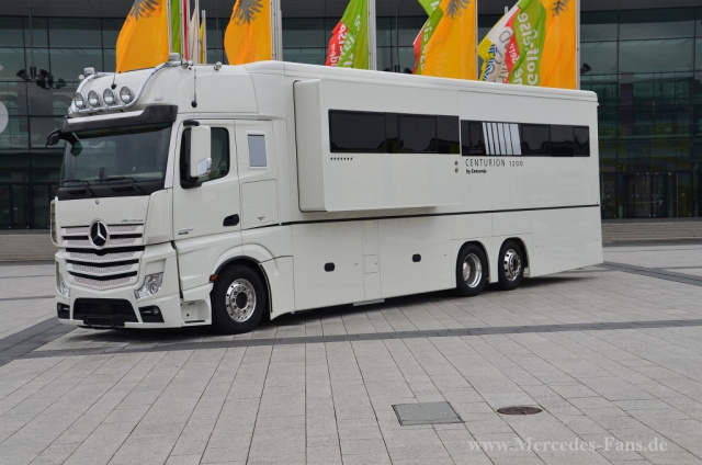 Als Unterbau des 26 Tonnen schweren Centurion dient das Modell Actros von Mercedes-Benz. Mit einer Leistung von 422 PS bietet der mit Turbolader aufgeladene 12,8 Liter große Reihensechszylindermotor ausreichend Reserven in allen Fahrsituationen. Für entspanntes und vor allem sicheres Reisen auch auf langen Strecken sorgen serienmäßig die Mercedes-Benz-Fahrassistenten wie das bewährte elektronische Bremssystem, der Stabilitätsregel-Assistent oder die radargesteuerten Hilfen zum Einhalten von Fahrspur und des Sicherheitsabstandes. Die ergonomisch geformten Klima-Schwingsitze bei Mercedes ebenfalls serienmäßig versprechen hohen Sitzkomfort für Fahrer und Beifahrer.