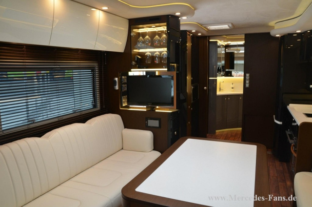 In punkto Einrichtung stehen bei der Wahl der Möbel besonders seltene und edle Echtholzfurniere zur Auswahl wie beispielsweise Amerikanische Kirsche, Nussbaum, Palisander oder Räuchereiche. Wir setzen um, was immer der Kunde sich in seinem Reisemobil wünscht, erläutert Baumgartner. Gleiches auch für die Gestaltung des restlichen Wohnbereichs sowie für das Schlaf-Appartement.