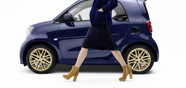 Unter dem Motto „Reveal the Iconic You!“ präsentiert Veronika Heilbrunner im Rahmen der Mercedes-Benz Fashion Week Berlin ihren individuell gestalteten smart fortwo | BRABUS tailor made. Mit der Kooperation zeigen smart und die international renommierte Stylistin die fast grenzenlosen Möglichkeiten zur Individualisierung, die das smart BRABUS tailor made Programm den Kunden bietet. Jeder kann sich seinen persönlichen smart gestalten. Der von Veronika Heilbrunner gestaltete Zweisitzer ist vom 17. bis 19. Januar 2017 zusammen mit hochwertiger Modefotografie und einem Behind-the-scenes-Video in der Berliner Appel Design Galerie zu sehen. Für die Außenlackierung hat die Streetstyle-Ikone den Farbton „velvet blue“ kreiert. Er lässt den sportlichen smart fortwo im Sonnenlicht glitzern. Passend dazu glänzen die Felgen in „royal gold“. Beide Farben wurden neu in den Farbkatalog des tailor made Programms aufgenommen. Im Innenraum dominiert schwarzes Leder. Kontrastierend dazu strahlt auf dem Schaltknauf eine maßgeschneiderte Glaslinse in Rubinrot. Die Kopfstütze des Fahrersitzes trägt die gestickten Initialen der Stylistin.