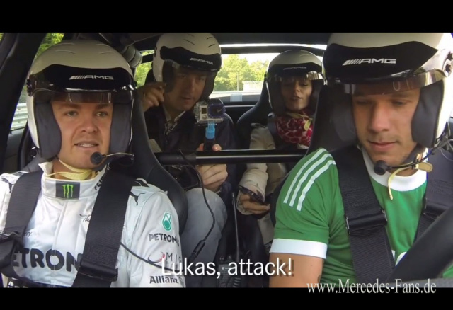 Dass der Arbeitsplatz in einem Mercedes-AMG-Sportwagen zuweilen einem heißen Stuhl gleicht - diese Erfahrung konnte Fußballnationalspieler Lukas Podolksi (derzeit beim britischen Club Arsenal unter Vertrag) jetzt auf dem Nürburging machen. Zusammen mit Nico Rosberg drehte er eine Runde um die Nordschleife im Mercedes C63 AMG. Als der Kicker dann das Steuer übernahm, spürte er es schon nach wenigen Metern: Der Mercedes AMG Sportwagen gehört zur Leider-geil-Kategorie. Sehen Sie selbst: