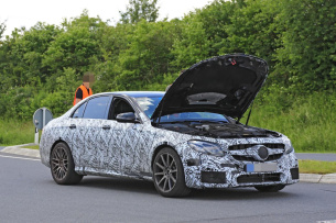 Jagdglück muss ein Jäger haben - dann klappt‘s auch mit außergewöhnlichen Erlkönigfotos. Dem Mercedes-Fans.de Erlkönigjäger gelangen jetzt die ersten Aufnahmen vom Motorraum des kommenden Mercedes-Benz E63 W213. Die Premiere der dynamischen E-Klasse lässt noch etwas auf sich warten. Aber Das Warten auf den neuen Mercedes-AMG E63 4MATIC wird sich lohnen, wie man aufgrund der technischen Vorabinformationen, die vor Wochen durchgesickert sind weiß.- Demnach wird der Mercedes-AMG E63 mit 571 PS und 750 Nm vorwärts drängen und der Mercedes-AMG E63 S wird mit 612 PS und 850 Nm maximalem Drehmoment nach vorne fahren. Als Quelle der Kraft wirkt in der dynamischen E-Klasse der 4-Liter-Biturbo-V8. Geschaltet wird per Neungang-Automatik. Die W213-Sportwagenqualitäten drücken sich auch in den Beschleunigungszeiten aus. Der neue Mercedes-AMG E63 wird von 0-100 km/h in 3,7 beschleunigen. Die S-Variante ist noch mal zwei Zehntel flotter. Bei 250 km/h ist bei beiden entfesselten E-Klassen mit AMG-DNA die Höchstgeschwindigkeit abgeregelt.