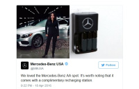 Es ist die erste vollelektrische Luxuslimousine, die vollständig von AA-Batterien mit je 1,5 Volt betrieben wird - und zwar von exakt 9.648 Stück. Für die Macher des Spaßes ein Schritt nach vorn in Sachen Elektromobilität, weil sich auf diese Weise das Suchen einer Steckdose erübrigt. Ist eine Batterie leer, wird sie einfach durch eine frische ausgetauscht. Eine charmante Idee und ganz witzig gemacht - aber diese Batterie gestützte Form des Electric Drive kann am Ende wirklich nur belächelt werden. Ein Mitarbeiter von Mercedes-Benz USA reagierte auf den Fake-TV-Spot mit Humor via Twitter Tweet, in dem er zur AA-Klasse das passende Mercedes-Benz-Ladegerät für AA-Akkus präsentierte und schrieb: "Wir lieben den Mercedes-Benz AA-Spot. Es sollte angemerkt werden, dass zum Auto ein passendes Ladegerät gehört." (siehe Bild links; das Bild lässt sich durch Anklicken vergrößern). (Video: YouTube, Screenshot von Twitter)