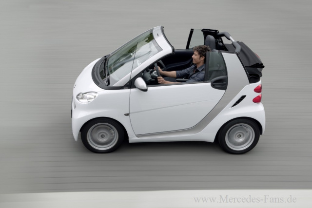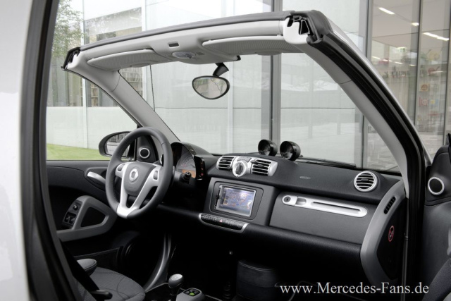 Mit neuen Cabrio-Verdeckstoffen in Rot und Blau und einer tridion-Sicherheitszelle in strahlendem Weiß erweitert smart die Möglichkeiten der Farbauswahl zusätzlich. In Verbindung mit der weißen tridion-Sicherheitszelle ist auch die Einfassung der Außenspiegel und die Kühlermaske weiß lackiert. Durch diese Kombinationsmöglichkeiten und modernen Farbkonstellationen zeigt der smart fortwo ein ganz neues Gesicht. Ein besonderer Blickfang sind optional erhältliche, markante LED-Tagfahrlichter. Drei 15-Zoll-Leichtmetallräder in neuem Design geben der Auswahl zum Thema Design und Style ebenfalls frische Impulse.
